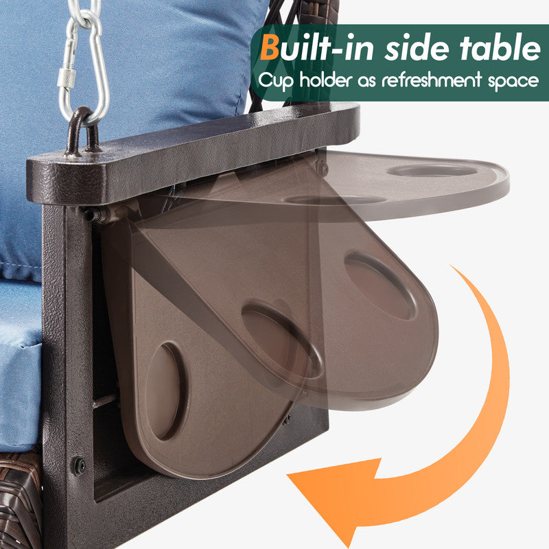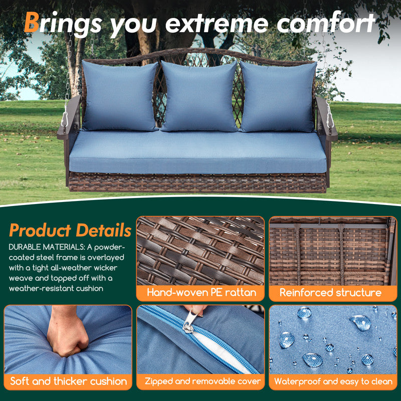 Upgraded Wicker Hanging Porch Swing Heavy Duty 900 LBS 3-Seat Outdoor Patio Swing Chair Bench for Adult w/ 8.9ft Hanging Chains Cushions and Cup Holder