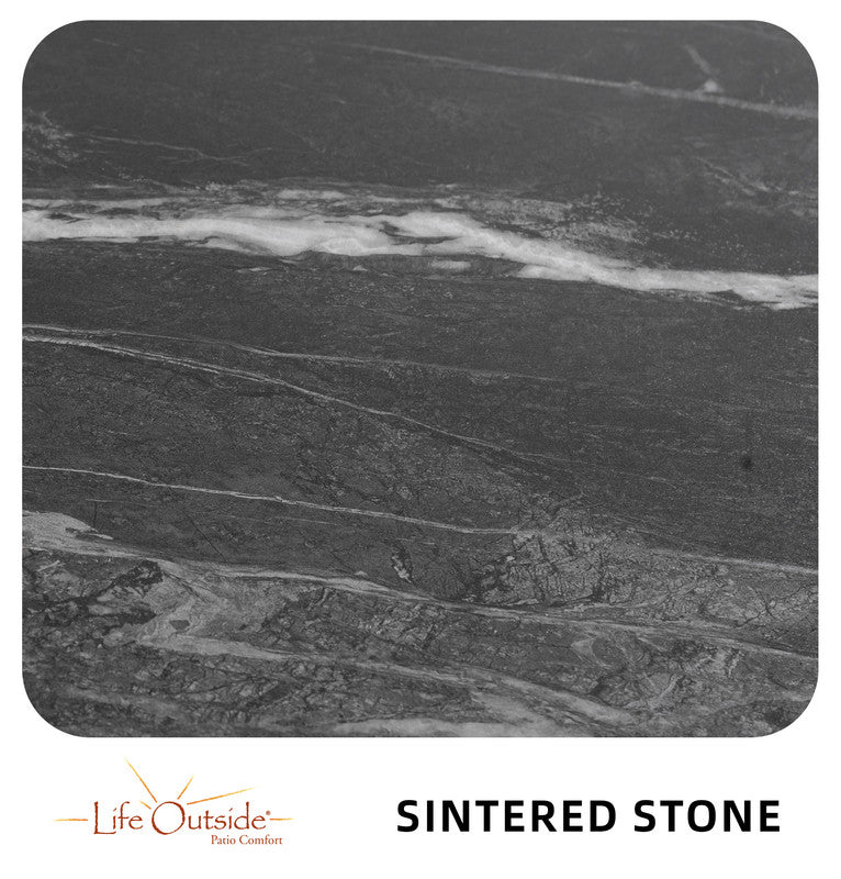 The black sintered stone top looks super sleek and modern. Very sturdy, easy to clean, and the umbrella hole is perfect for sunny days. Totally transformed my patio!